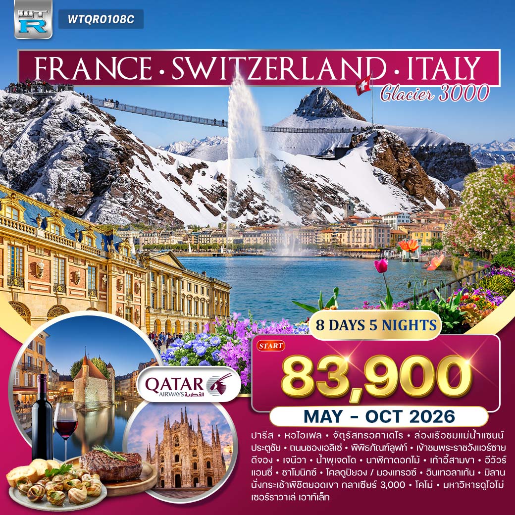 มื้อพิเศษ : สปาเก็ตตี้หมึกดำ – พิซซ่าอิตาเลียนแท้ – ดินเนอร์วิวเทือกเขาแอลป์ – บุฟเฟต์ภัตตาคารบนยอดเขาทิตลิส – ดินเนอร์สามคอร์สฝรั่งเศส (หอยเอสคาโก้ + สเต๊ก + ไวน์แดง)